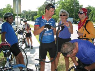 | later this morning, anne (in the orange top in the photo) had help from an unexpected source in getting to st. augustine. her back tire went flat; it's very hard to change, & patty (today's sag person--in the blue tank top) wasn't having much luck with it either. then along came the 3 fellows in this photo. they're from ohio. they left san diego on mar 31 & plan to arrive in st. augustine tomorrow, thus completing the southern tier route in 30 days (at approx 100 miles per day). they did say that they sometimes took a different road than recommended by adventure cycling if it provided them a more direct route & saved them miles. one of their wives is providing sag support. |