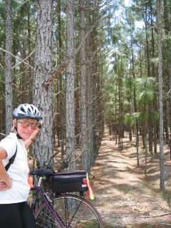 | today we noticed quite a few stretches of heavily wooded areas that looked like tree farms; here's a photo of one, with the trees planted in very straight rows. as you would expect, we had to share our roads with some loaded logging trucks today. |