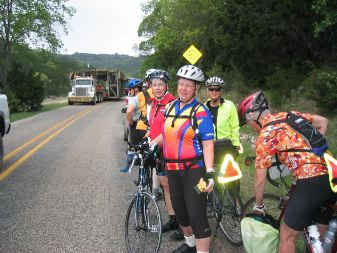 | sari & i hadn't gotten more than 6-7 miles out of campwood when we were stopped. in about 10 mins, the first truck with part of the oil rig came toward us. here we are waiting for it to pass so we can pedal up the hill. from left are bryn & anne (looking forward), then sandy, mary (from boston), carolyn, & marilyn boger. (mary isn't really balancing a road sign on her head; it just looks that way in this photo.) |
